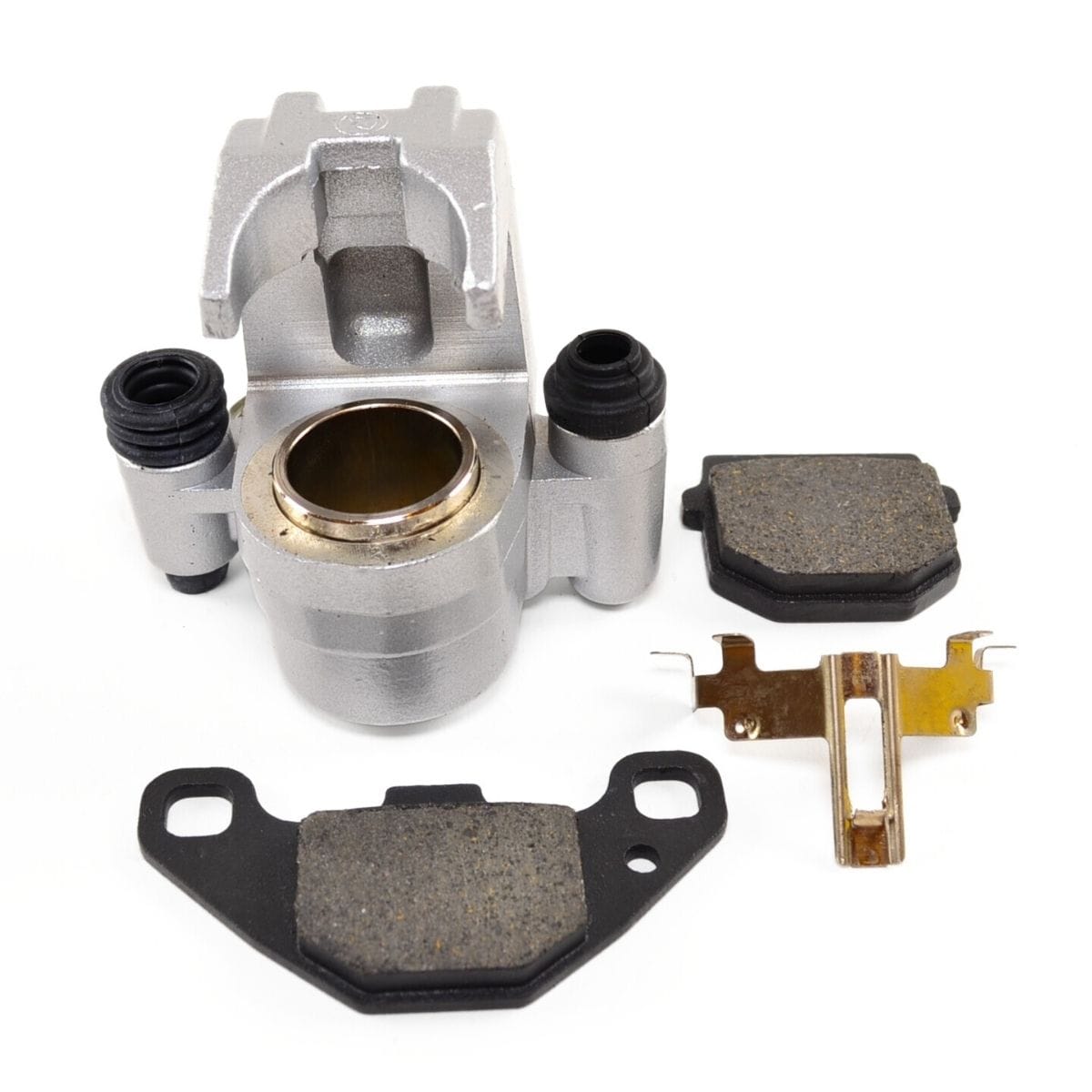Etujarrusatula / takajarrusatula ilman kannatinta/kiinnikettä Rieju MRT ja Drac 50 mopoihin. Sisältää kaiken kuvassa näkyvän: jarrusatulan, jarrupalat, jarrusatulan jousen, ilmaruuvin ja banjopultin tiivisteineen.