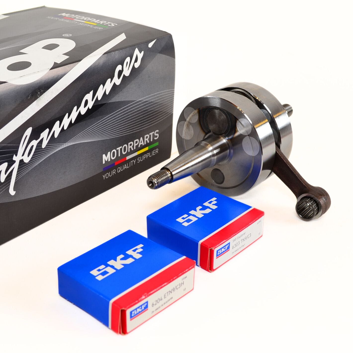 Pakkaus sisältää täydellisen kampiakselin, männäntapin neulalaakerin ja SKF 6303 TN9 C3 ja 6204 TN9 C3H runkolaakerit, joiden kuulapitimet ovat polyamidia ja välyysluokka on C3.